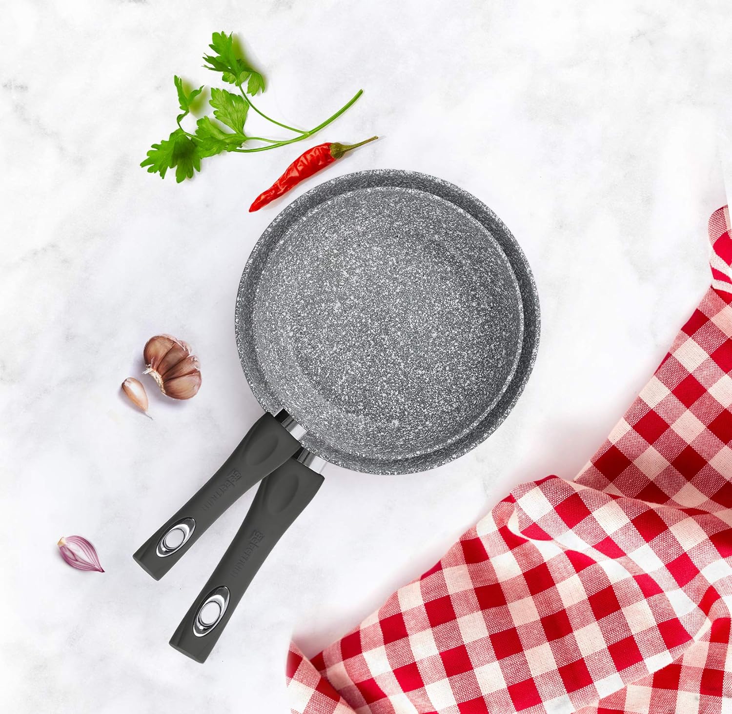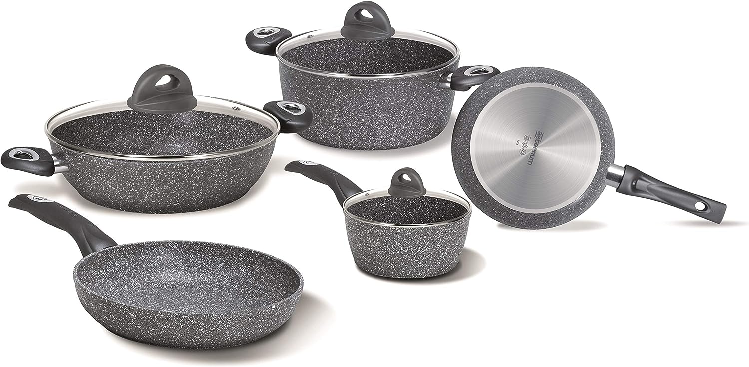 - [CARATTERISTICHE TECNICHE]: Realizzate con un corpo in alluminio ad elevato spessore che garantisce performace di cottura eccellenti; Il rivestimento antiaderente è particolarmente resistente e assicura una lunga durata; la presenza di microparticelle di pietra permette una cottura nauturale, sana e priva di olii e grassi aggiunti; Grazie al manigliame ergonomico in bachelite con finitura soft, l'utilizzo risulta pratico e la presa salda e sicura