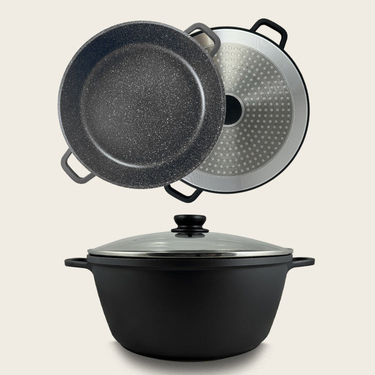 Casseruola in alluminio pressofuso con innovativo rivestimento antiaderente ed utilizzabile in forno. Il coperchio in vetro temperato, per avere un uniforme distribuzione del calore, è composto da valvola di sfiato e bordo in acciaio. Lavabile in lavastoviglie. Disponibile in diverse misure.
