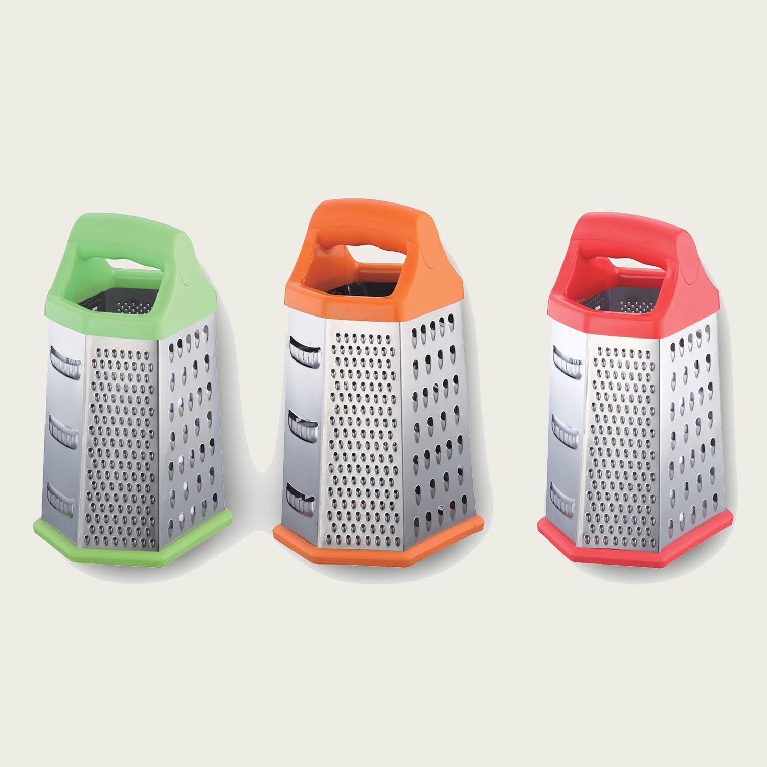 Grattugia in acciaio 6 lati con manico e base in gomma, 6 tipologie di taglio.