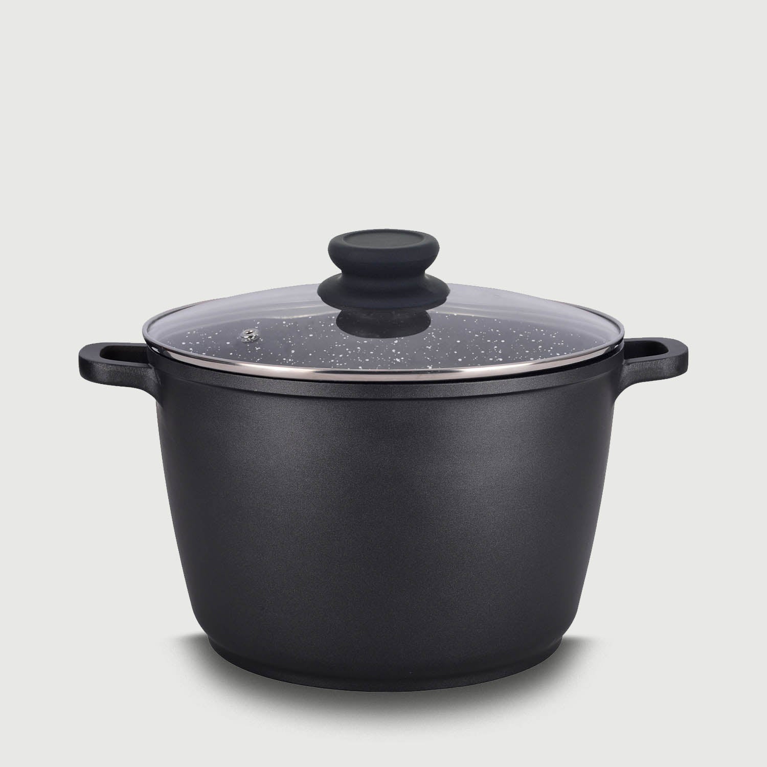Pentola in alluminio pressofuso con innovativo rivestimento antiaderente ed utilizzabile in forno. Il coperchio in vetro temperato, per avere un uniforme distribuzione del calore, è composto da valvola di sfiato e bordo in acciaio. Lavabile in lavastoviglie. Disponibile in diverse dimensioni.