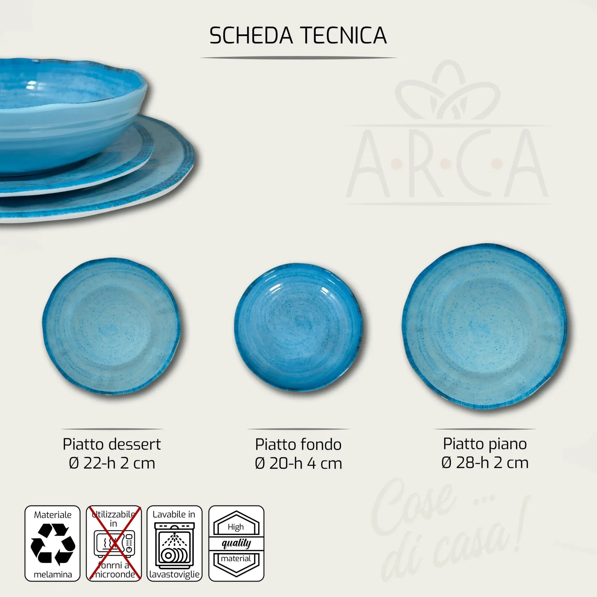 Realizzati in melamina, possono essere lavati in lavastoviglie (a una temperatura massima di 70°), risultano molto semplici da pulire