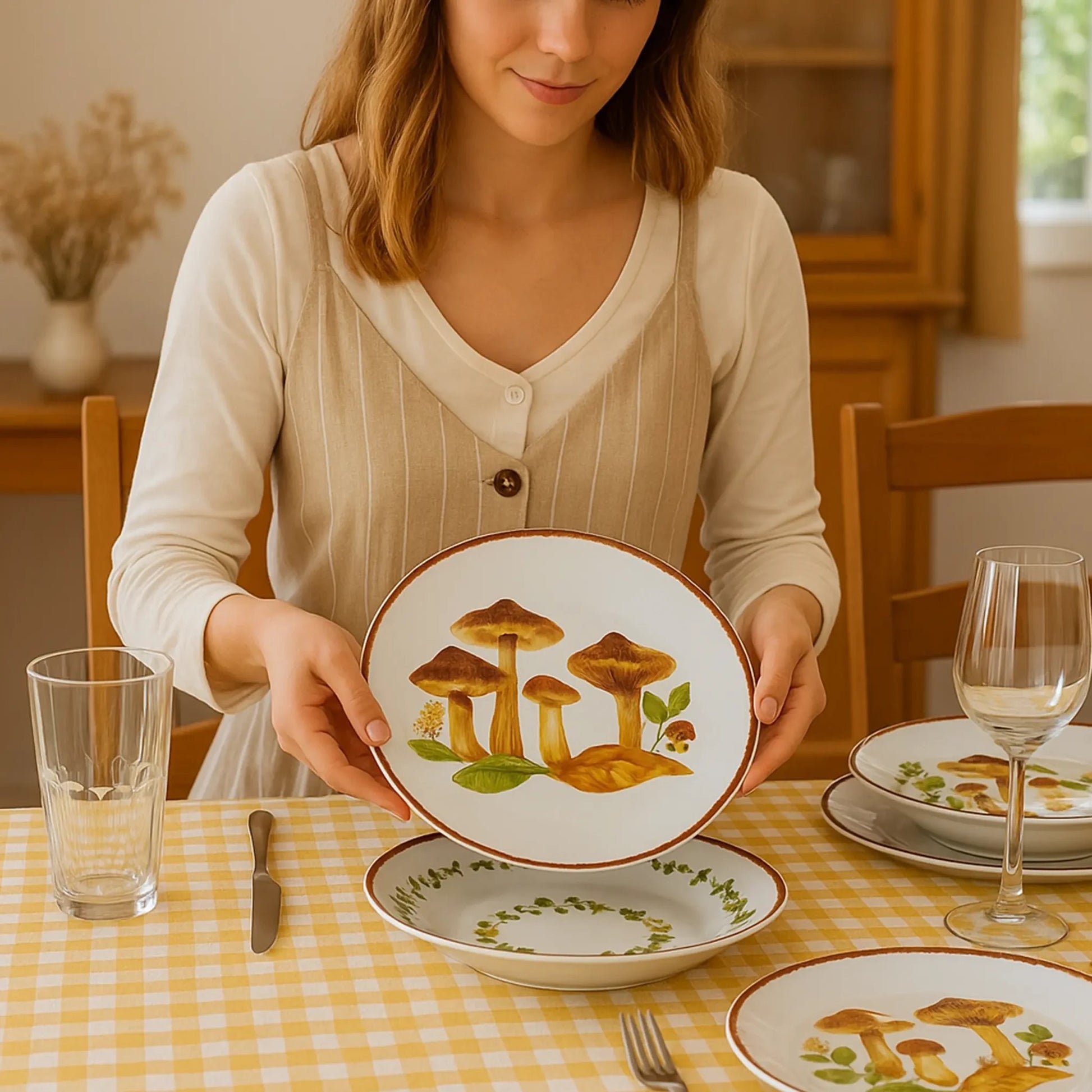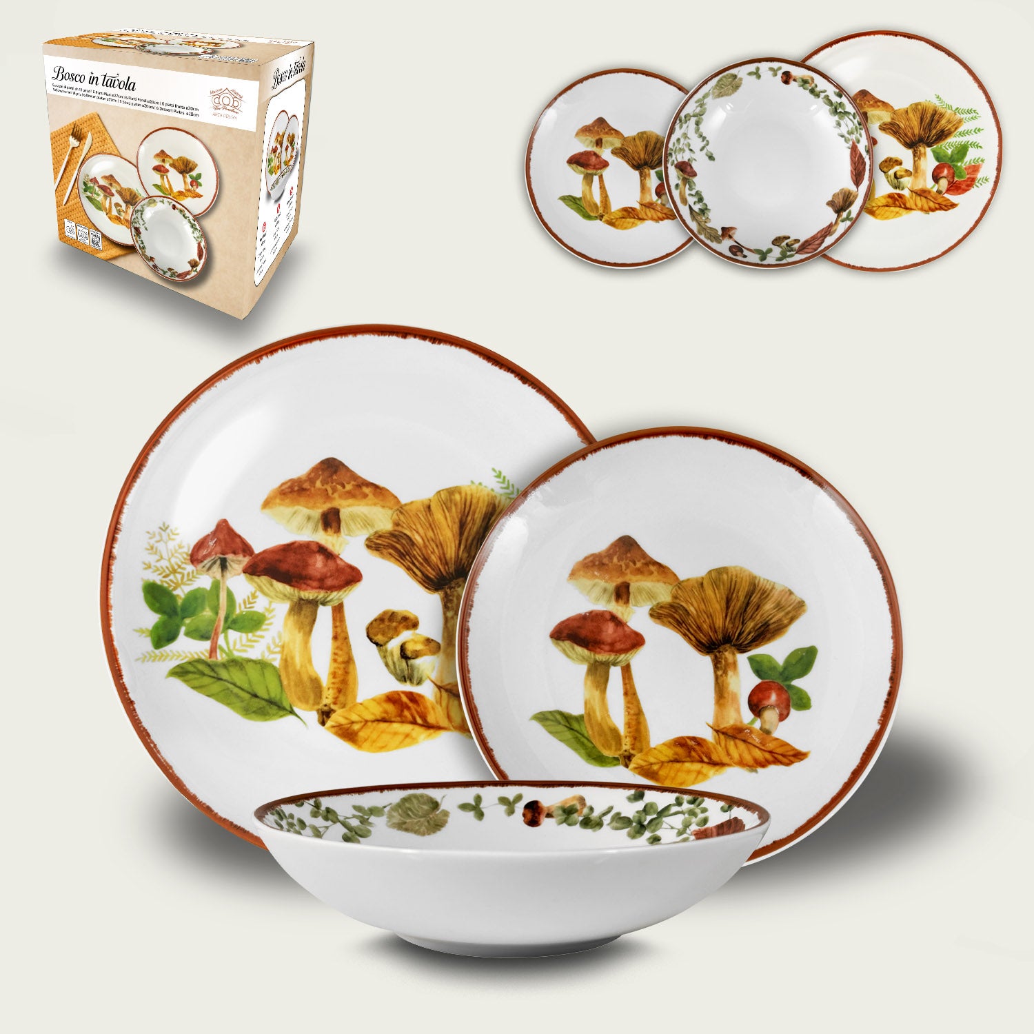 Il design con funghi realistici, foglie di felce e dettagli autunnali trasforma ogni piatto in una tela. Il bordo con finitura “grezza” e il colore terracota aggiungono un tocco rustico e autentico