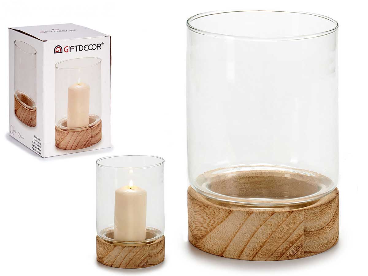 ARTE REGAL PORTACANDELA VETRO MEDIO IN BASE LEGNO MIS.11,5X11,5X16CM.
