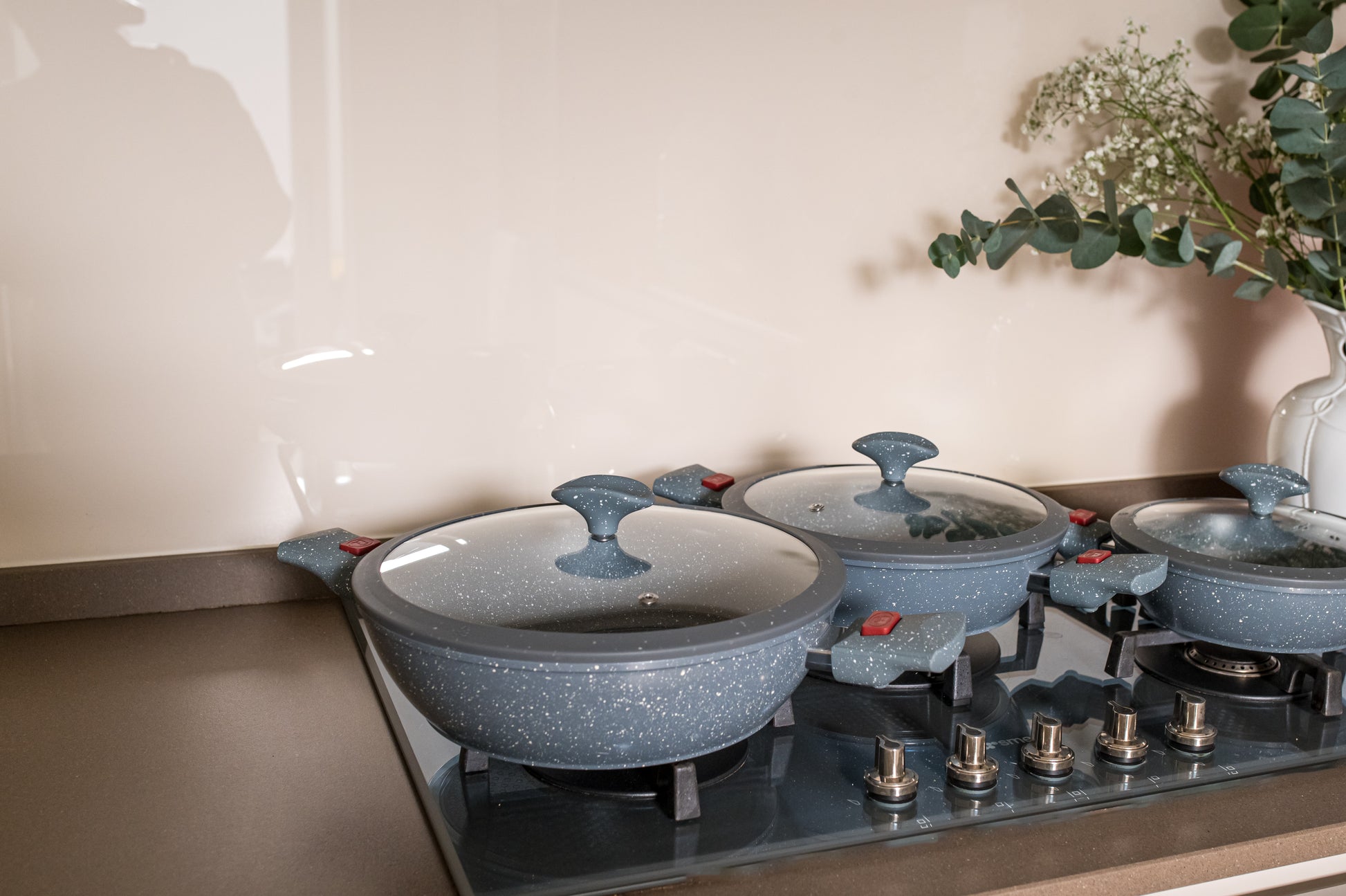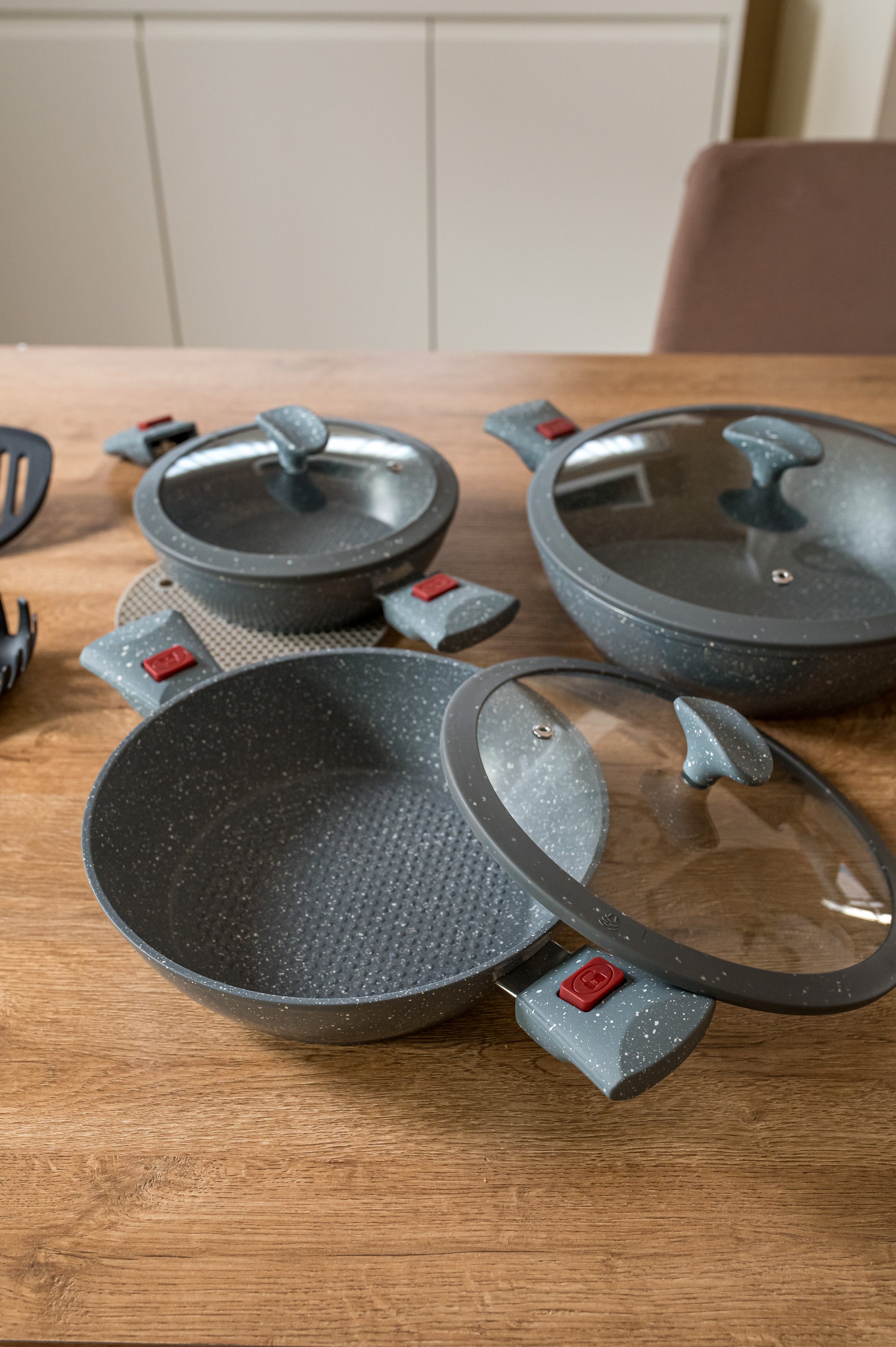 Questo set offre una combinazione di pentole di diverse dimensioni e utensili che permettono di eseguire diverse tecniche di cottura, dalla bollitura alla frittura. Il rivestimento in pietra promette una buona distribuzione del calore e una cucina più sana. Nel complesso, sembra essere un set di tegami di buona qualità e versatile per soddisfare le esigenze di una cucina domestica.