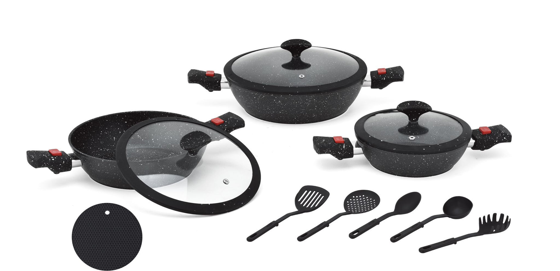 * Un tegame con coperchio da 28 cm, ideale per cucinare grandi quantità di cibo* Un tegame con coperchio da 24 cm, perfetto per piatti di media grandezza* Un tegame con coperchio da 20 cm, ottimo per piccole porzioni o contorni* 5 mestoli in nylon resistenti al calore e sicuri per l'uso con pentole antiaderenti