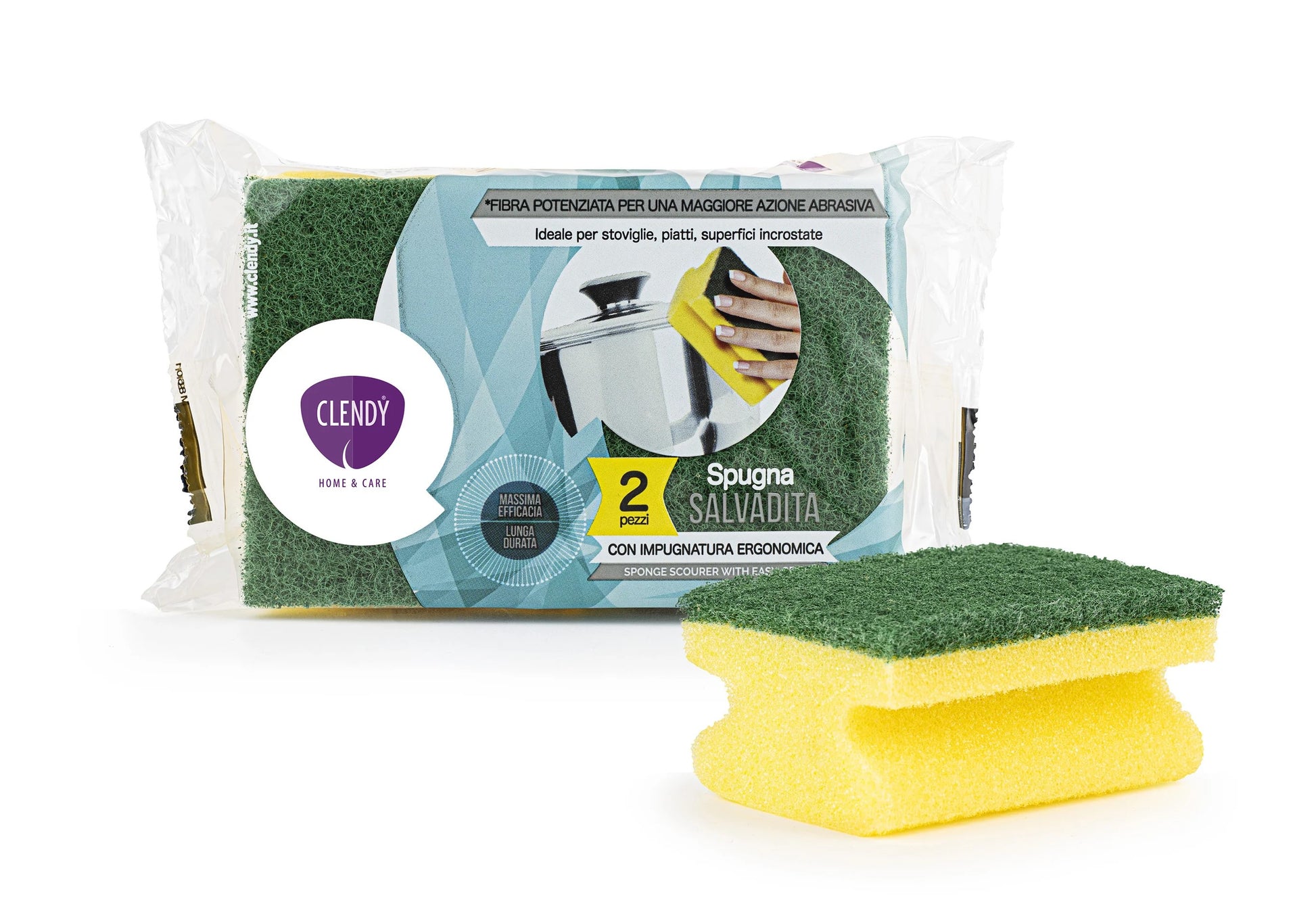 Impugnatura Ergonomica: la spugna salvadita Clendy è realizzata in maniera ergonomica al fine di una migliore comodità di azione e al fine di preservare l'integrità delle dita