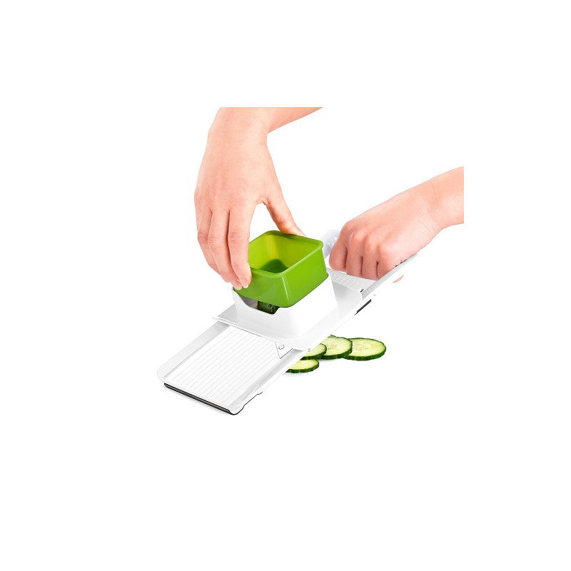 Questo affettaverdure è lo strumento ideale per affettare sottilmente frutta e verdura con precisione, grazie alla lama in acciaio inox regolabile su tre spessori: 1, 2 o 3 mm. Perfetto per ottenere fette uniformi in base alle tue esigenze culinarie, l'affettaverdure è dotato di un sistema di protezione con carrello che fissa gli alimenti, garantendo sicurezza durante l'utilizzo. Il design orizzontale della lama e il movimento scorrevole rendono la preparazione rapida ed efficace.