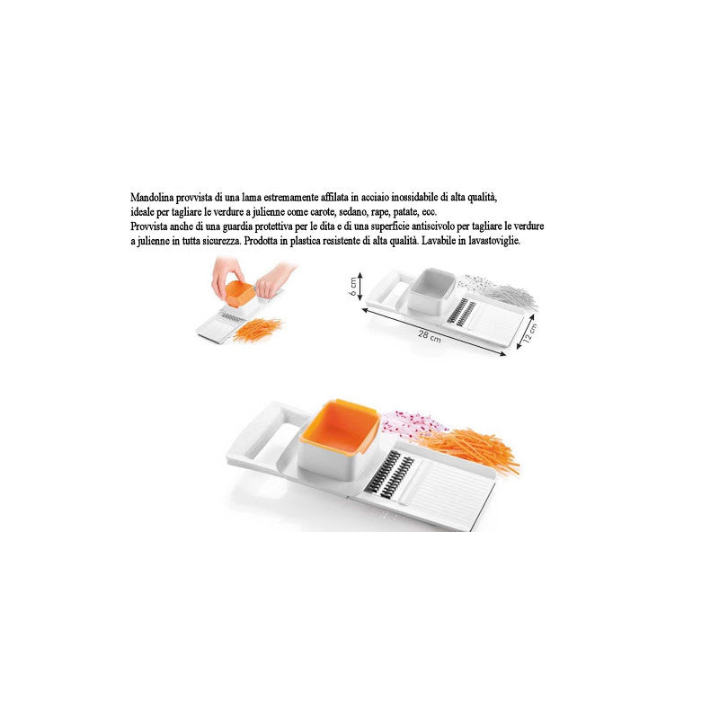 Questo affettaverdure è pensato per chi ama cucinare in modo pratico e sicuro, senza rinunciare alla precisione. Con la lama regolabile, puoi decidere lo spessore ideale per le tue preparazioni: fette sottilissime per carpacci di verdure, fette medie per insalate croccanti o tagli più spessi per gratin e preparazioni al forno. La lama in acciaio inox garantisce tagli netti e precisi, preservando l'integrità degli alimenti. Il carrello di protezione rende l'affettaverdure sicuro e facile da usare, anche per chi non ha molta dimestichezza con questo tipo di utensili. Basta fissare l'alimento sul carrello e farlo scivolare ripetutamente sulla lama per ottenere fette perfette in pochi secondi. Ideale per preparare piatti come insalate, patate al gratin, chips di verdure e molto altro, questo affettaverdure sarà un alleato insostituibile nella tua cucina. Grazie al design compatto, occupa poco spazio ed è facile da pulire, rendendolo perfetto per l'uso quotidiano.