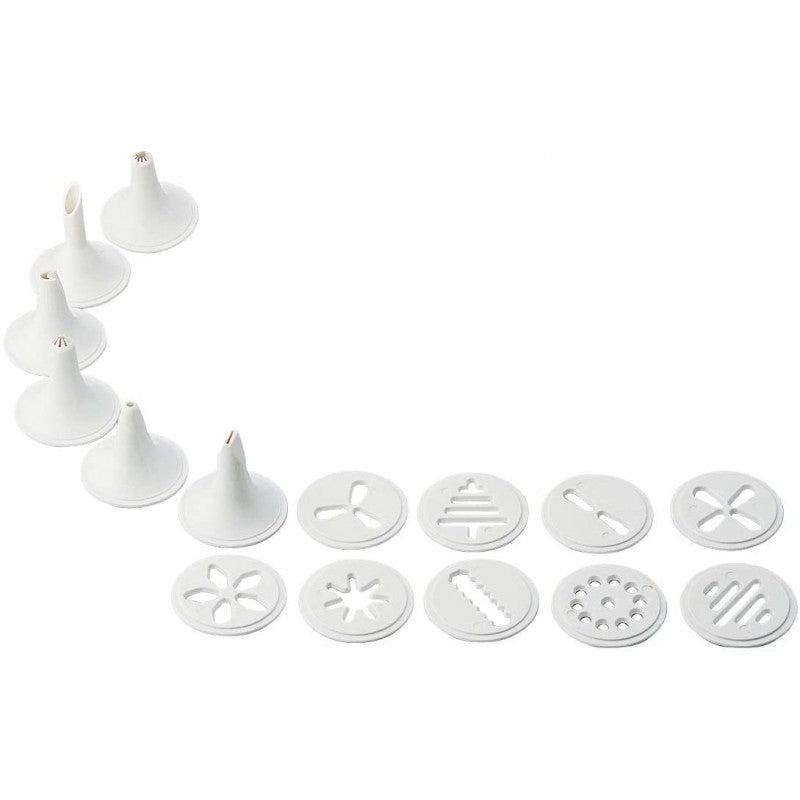 Nel kit sono inclusi: 10 trafile circolari, 6 beccucci decoratori, ricette e istruzioni per l'uso.